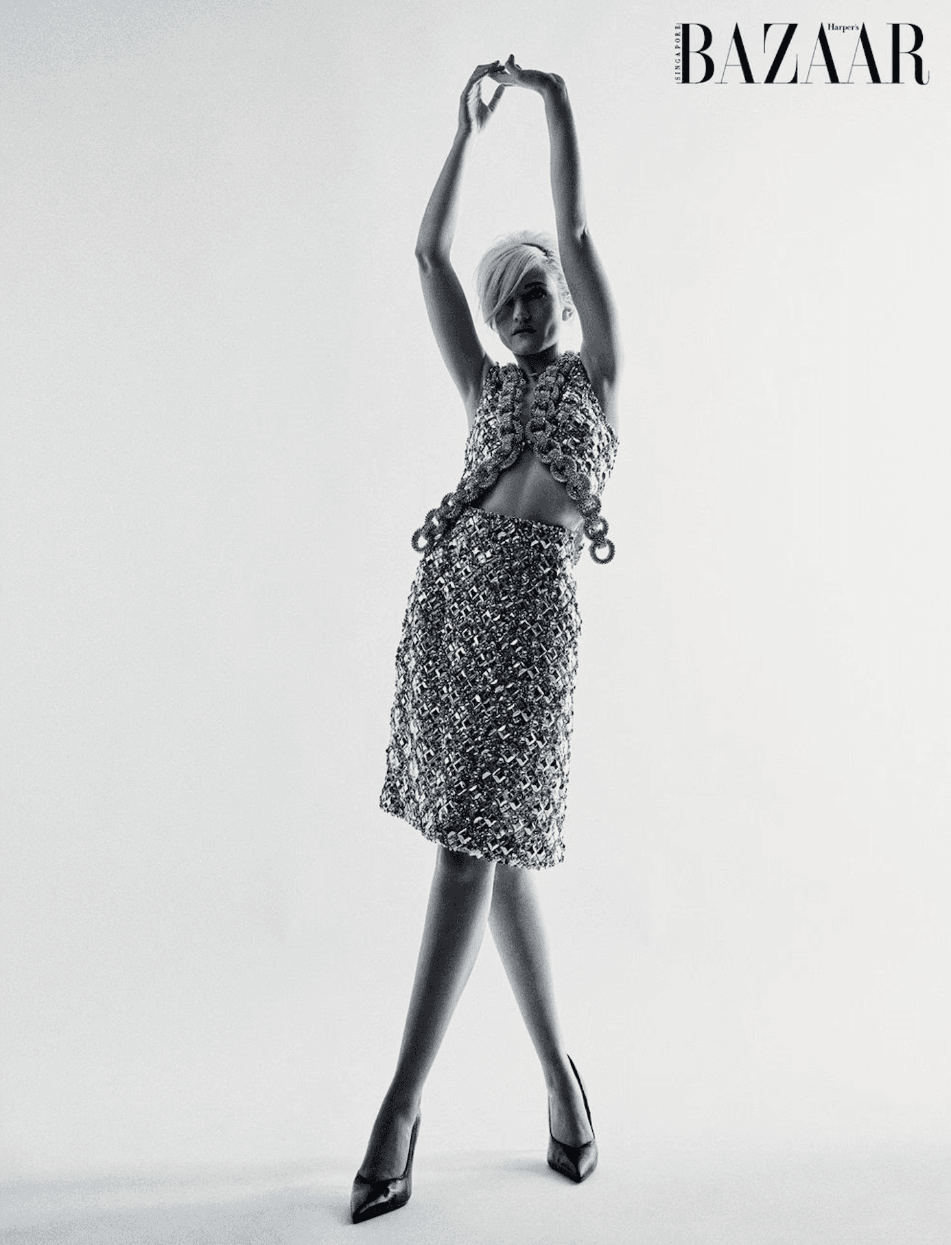 Cover story editorial for Harper’s Bazaar Singapore (January 2022) featuring actress Julia Garner. Titled “Julia Reinvented,” the series pairs clean, character-led portraiture with high fashion styling, including Prada and Tiffany & Co. jewelry on the cover and additional looks from Hervé Léger, Valentino, St. John, Balenciaga, and Celine by Hedi Slimane. The story was produced with a polished magazine finish and a minimal, graphic approach to light and silhouette, designed for global print and digital rollout as the lead issue cover feature.